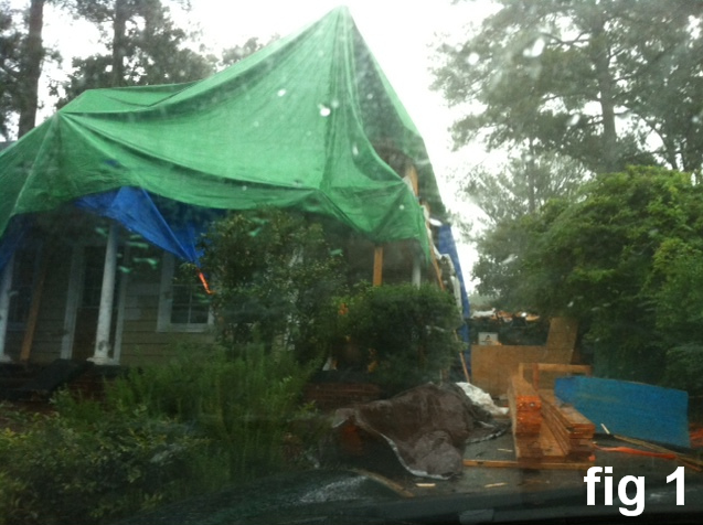 Previous on “The Life of Paul” All last weekend I found myself working on computers and cleaning the house. Until Sunday afternoon when I pestered my carpenter for side work and he finally said “I got a house you can tarp for me, if you want. I gotta do it before it rains anymore.” House tarping is like any other job, you need 10,000 hours of training and immersion to be your best. I’ve probably got about 4 hours under my belt. I really and conscious though that as a civilian I’m basically asking to be accepted not as a jaw jacking tourist. I’d like to work with my carpenter as much as possible, the only way I’ll continue to build my skills is if I’m staying inside the walls of houses. I need a transition path and carpentry is so honest feeling. Likewise I have no interest in working outside when it’s hot, if there are bugs around or heights involved; please see again my apt comment on being a tourist. These guys do that all the time, they don’t work through the rain, but they do sometimes work against the rain, like the house in figure 1. It’s in some chic-chi neighborhood that neither you nor I could afford and a second floor is being added. In addition to everything else this is a project where the homeowners wanted to say parts of the lower level, like ceilings, floors, stuff like that. Rule 1 of remodeling, try to save everything you can, but do not be penny wise and pound foolish.